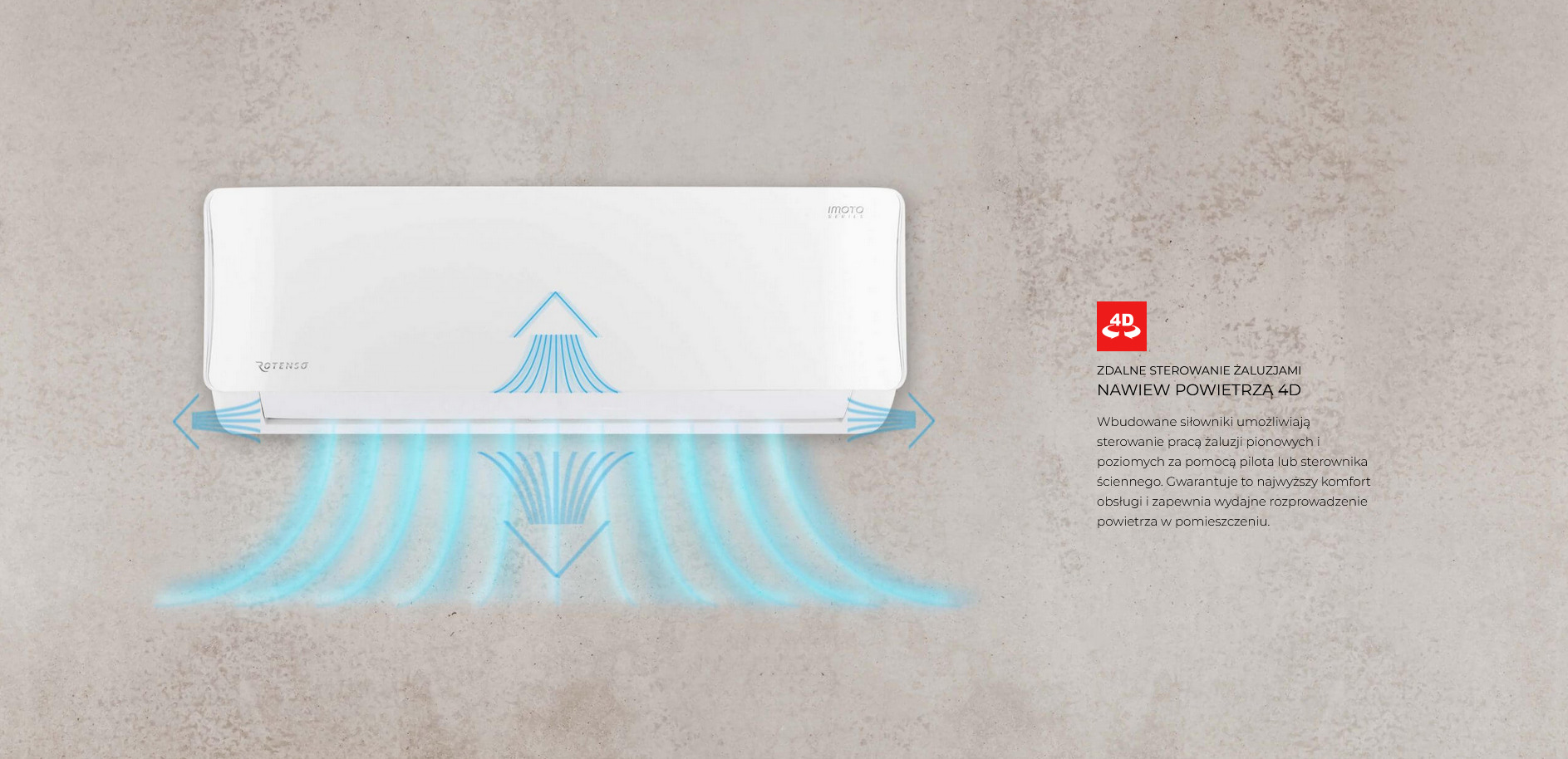 Klimatyzator wydajnie rozprowadza powietrze dzięki systemowi automatycznego nawiewu 4D. Umożliwia on sterowanie pracą żaluzji pionowych i poziomych za pomocą pilota.