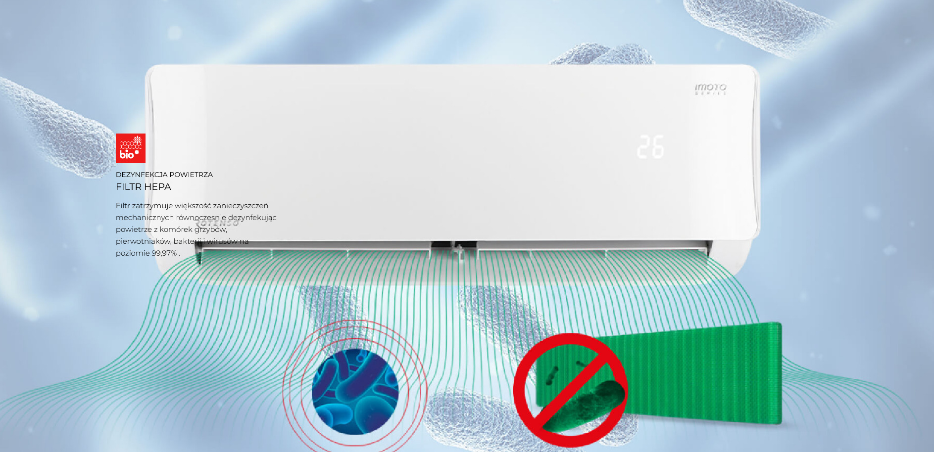 Imoto posiada w standardzie aż trzy filtry, które odpowiadają za usunięcie z powietrza szerokiej gamy zanieczyszczeń (m.in. kurz, alergeny, pyłki, grzyby, bakterie i wirusy) oraz jonizator powietrza. Zapewniają one odświeżone powietrze w pomieszczeniu.