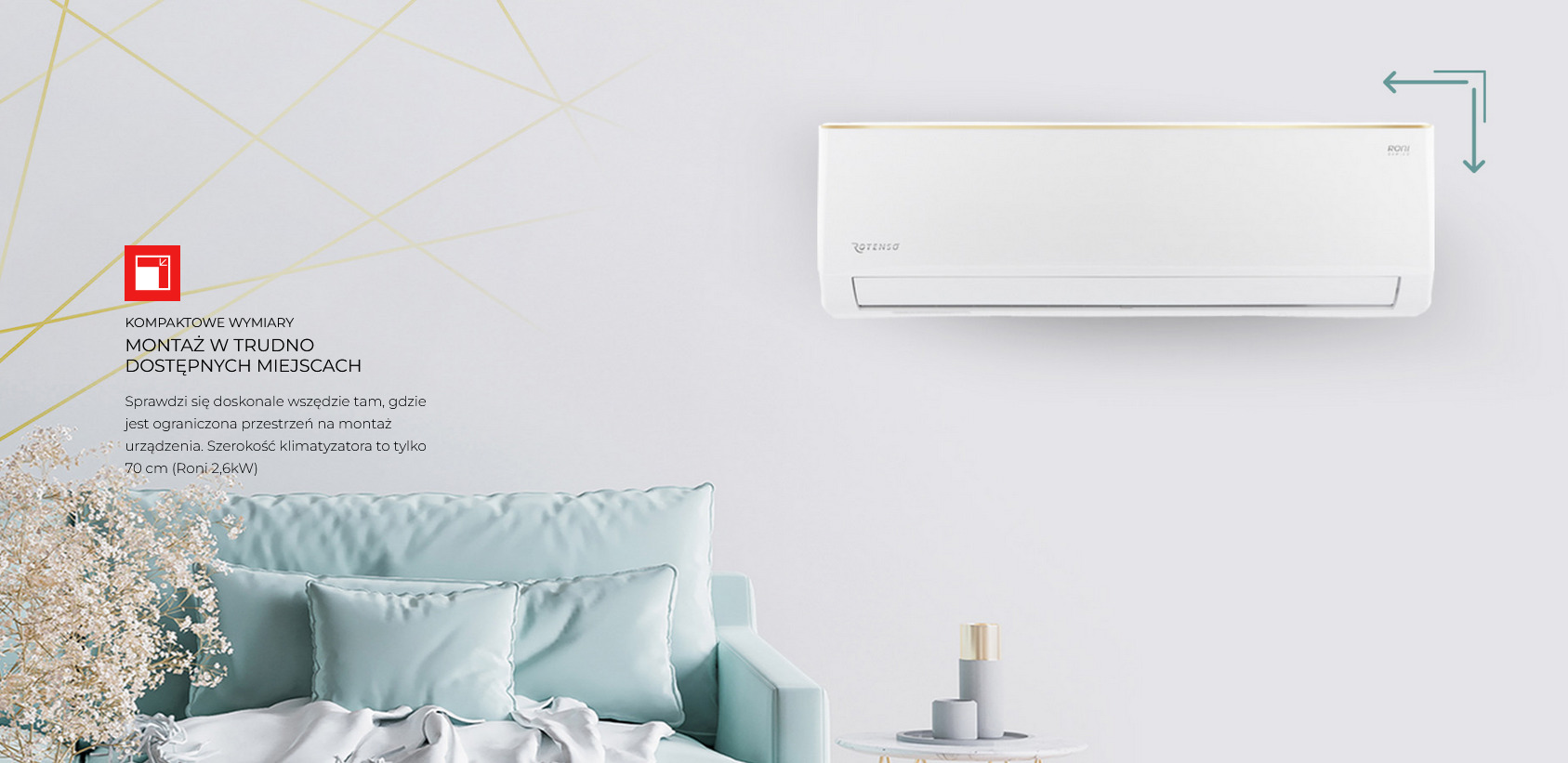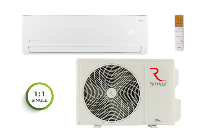 Model Roni to bardzo popularna jednostka w ofercie Rotenso. Jego zaletą są niewielkie rozmiary pozwalające na dyskretny montaż, szczególnie gdy do dyspozycji jest ograniczona przestrzeń. Optymalne parametry i pakiet niezbędnych funkcji sprawia, że klimatyzator Roni to doskonały wybór. Klasyczny, biały wygląd, delikatnie złamany złotą linia idealnie wkomponuje się w wystrój niemalże każdego pomieszczenia.