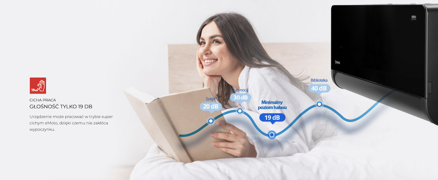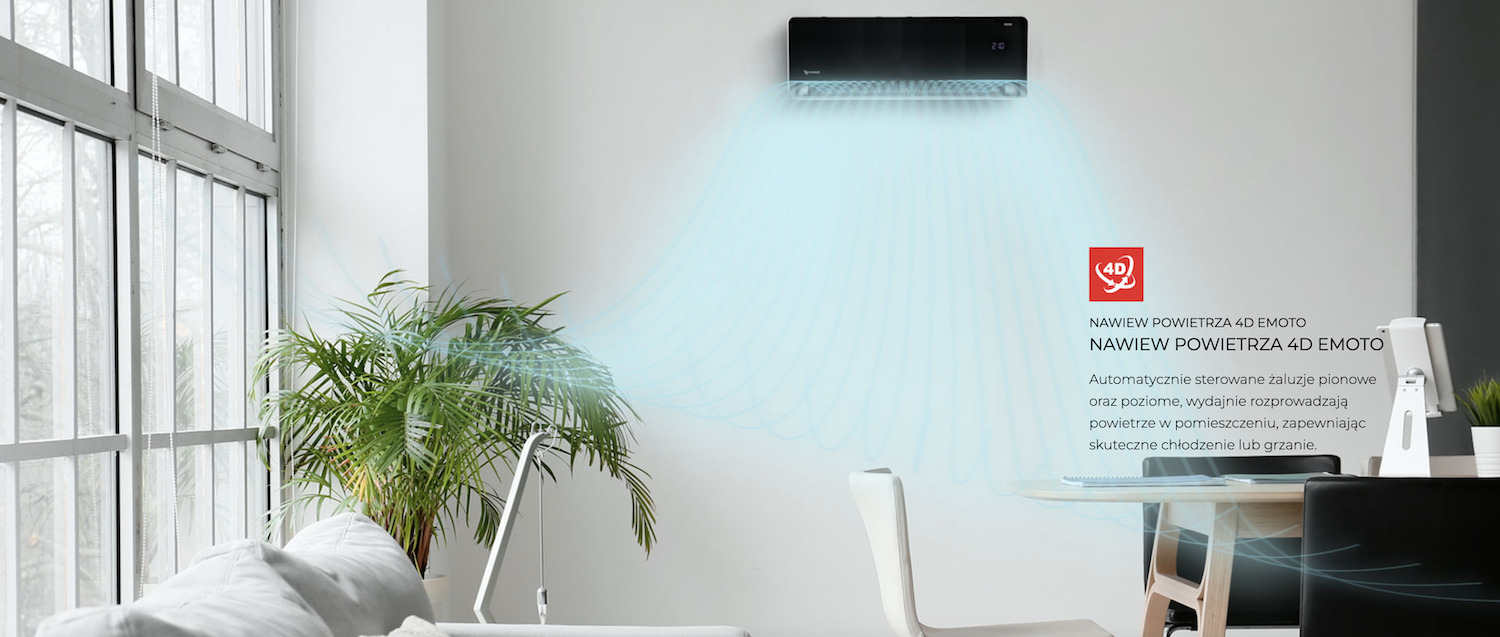 Delikatny kaskadowy nawiew powietrza 180°, realizowany dzięki obracającej się wokół własnej osi żaluzji poziomej, cicha praca, tylko 19 dB, oraz zaawansowany system oczyszczania powietrza to zalety tego niezwykle wydajnego, całorocznego urządzenia o najwyższej klasie efektywności energetycznej chłodzenia A+++.